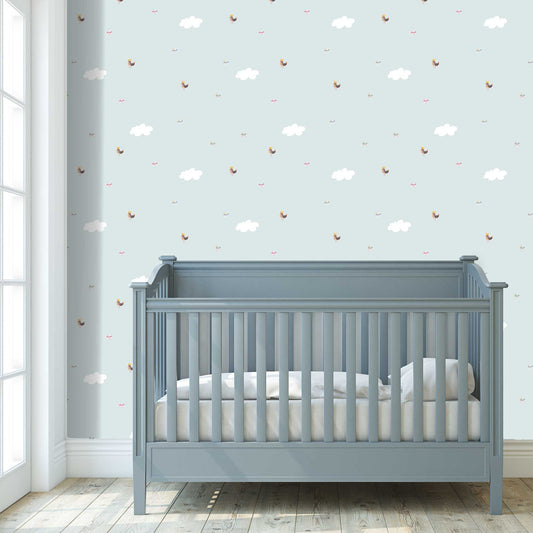 Nursery Wallpaper Rainbows, Cute Birds, Bunnies, Fluffy White Clouds.