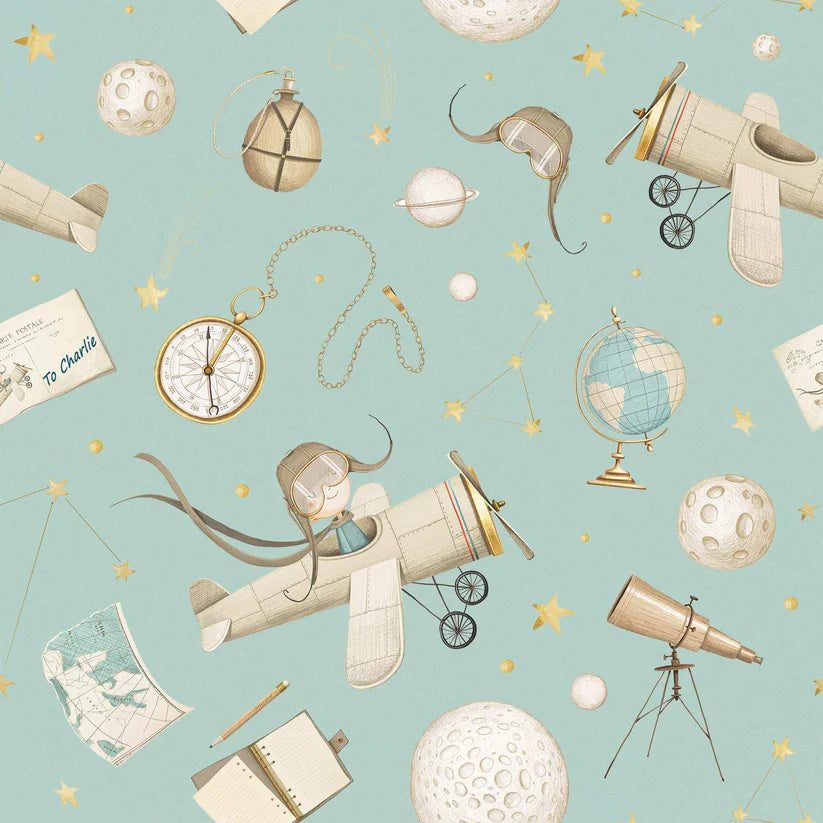 Transform your child's room into a magical space of discovery with our bespoke luxury wallpaper featuring flying time machines, telescopes, maps, stars, planets, and a shimmering gold compass. Designed to inspire curiosity and calm excitement, this personalised wallpaper brings the wonders of astronomy to life, making learning fun and imaginative. Perfect for babies, toddlers, and children, it creates an engaging environment that sparks creativity while providing a soothing backdrop for restful moments. Elevate your nursery or playroom with a unique design that celebrates the joy of exploration and the beauty of the cosmos.