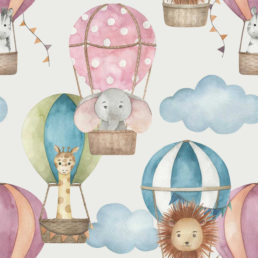 Discover exquisite, luxury personalized children's wallpaper, crafted in the UK using premium materials. This charming design features hot air balloons drifting through fluffy clouds, alongside adorable lions, elephants, zebras & giraffes perfect for creating a magical space in nurseries and playrooms.